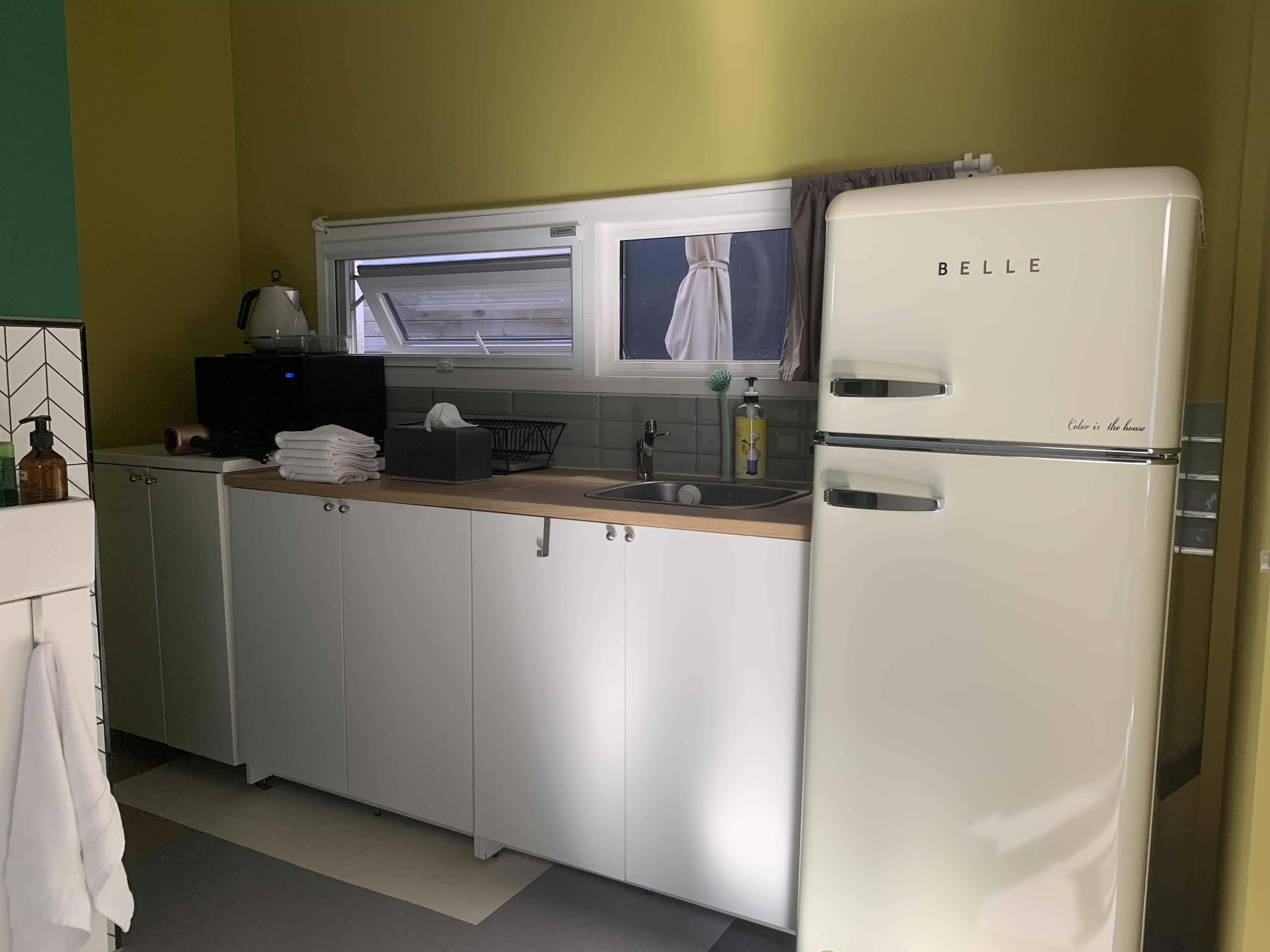 펜션에 맞게 깨끗한 주방과 가지런히 정리된 식기들!