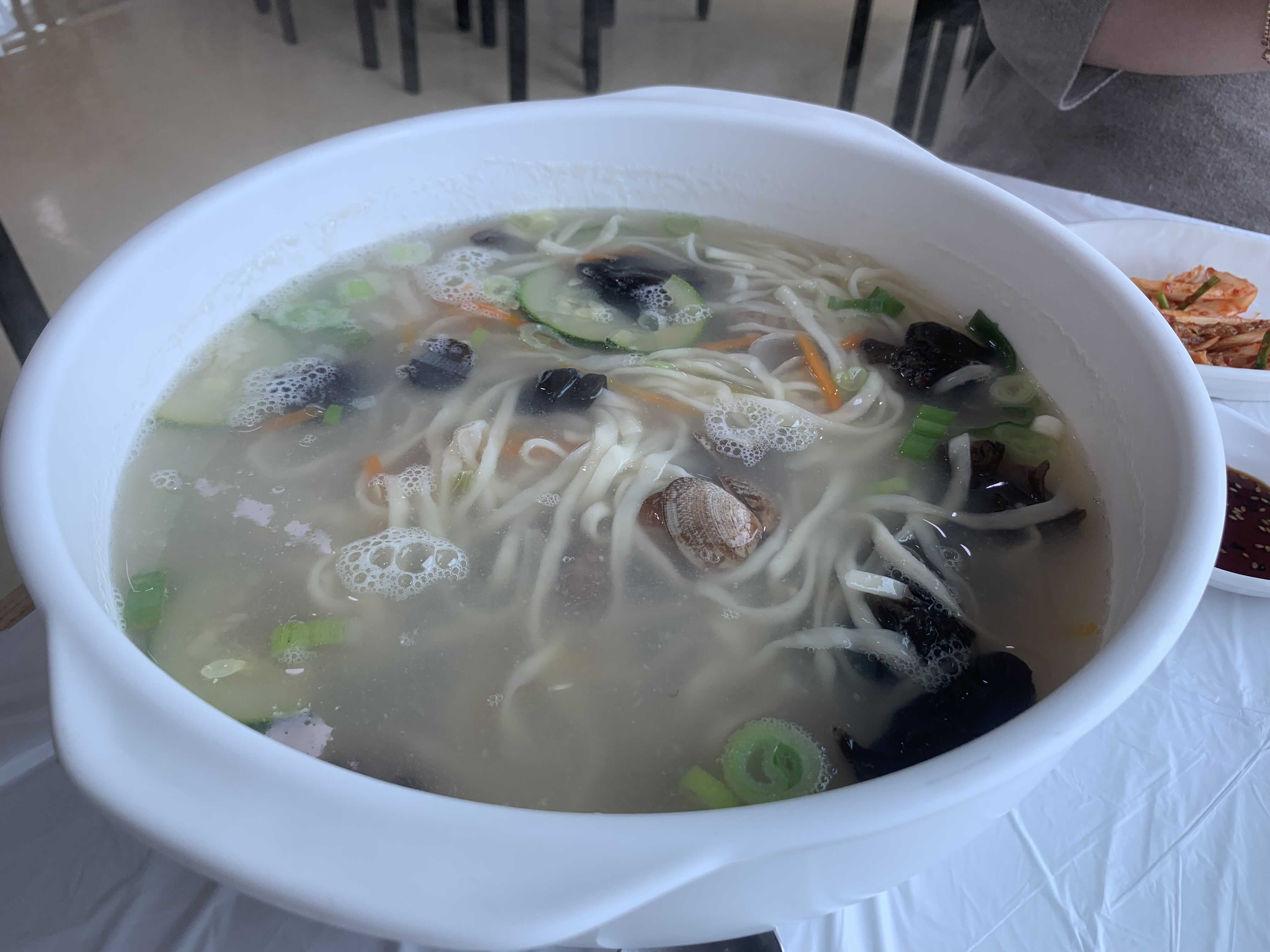 아침은 해물칼국수! 태풍의 비를 뚫고..