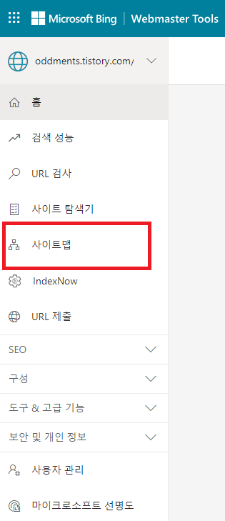 Bing 웹마스터 도구 관리 사이트에 들어가셔서 좌측 메뉴에서 '사이트맵'을 선택해주세요.