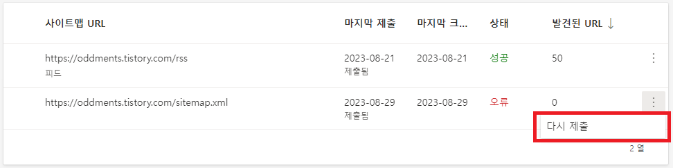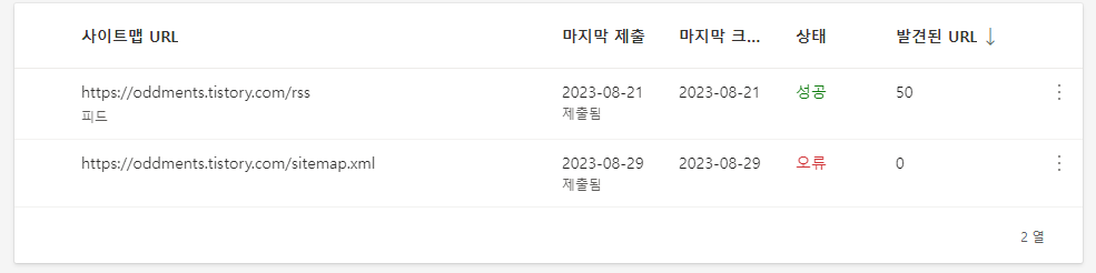 보시는 것처럼 rss는 정상이지만 sitemap.xml 은 오류로 상태가 떠있습니다.